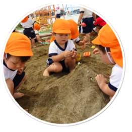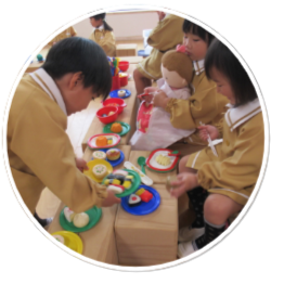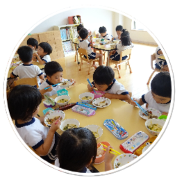 その後は、年齢別保育(言語、運動、音楽、絵画、造形、お話など)を行います。